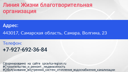 Линия Жизни, благотворительная организация по адресу 443017, Самарская область, Самара, Волгина, 23 в дальнейшем Организация, размещена в следующих категориях: