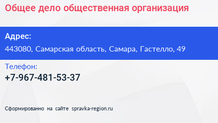Общее дело, общественная организация по адресу 443080, Самарская область, Самара, Гастелло, 49 в дальнейшем Организация, размещена в следующих категориях: