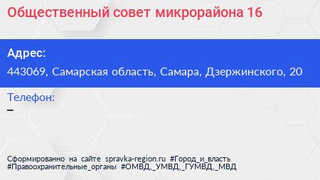 Общественный совет микрорайона №16 по адресу 443069, Самарская область, Самара, Дзержинского, 20 в дальнейшем Организация, размещена в следующих категориях:
