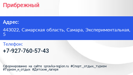 Прибрежный по адресу 443022, Самарская область, Самара, Экспериментальная, 5 в дальнейшем Организация, размещена в следующих категориях: