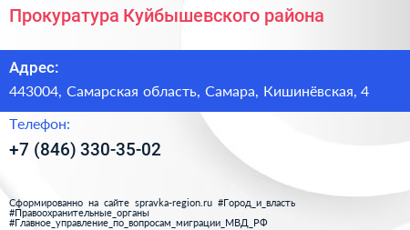 Прокуратура Куйбышевского района по адресу 443004, Самарская область, Самара, Кишинёвская, 4 в дальнейшем Организация, размещена в следующих категориях: