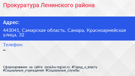 Прокуратура Ленинского района по адресу 443041, Самарская область, Самара, Красноармейская улица, 32 в дальнейшем Организация, размещена в следующих категориях: