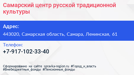 Самарский центр русской традиционной культуры по адресу 443020, Самарская область, Самара, Ленинская, 61 в дальнейшем Организация, размещена в следующих категориях: