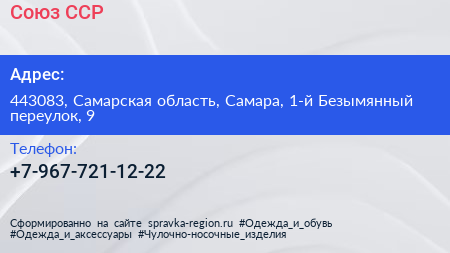 Союз ССР по адресу 443083, Самарская область, Самара, 1-й Безымянный переулок, 9 в дальнейшем Организация, размещена в следующих категориях: