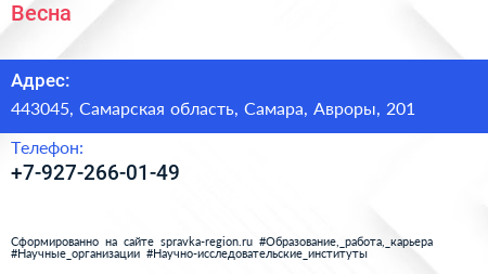 Весна по адресу 443045, Самарская область, Самара, Авроры, 201 в дальнейшем Организация, размещена в следующих категориях: