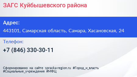 ЗАГС Куйбышевского района по адресу 443101, Самарская область, Самара, Хасановская, 24 в дальнейшем Организация, размещена в следующих категориях: