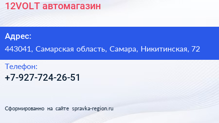 12VOLT, автомагазин по адресу 443041, Самарская область, Самара, Никитинская, 72 в дальнейшем Организация, размещена в следующих категориях: