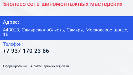 5колесо, сеть шиномонтажных мастерских по адресу 443013, Самарская область, Самара, Московское шоссе, 1Б в дальнейшем Организация, размещена в следующих категориях: