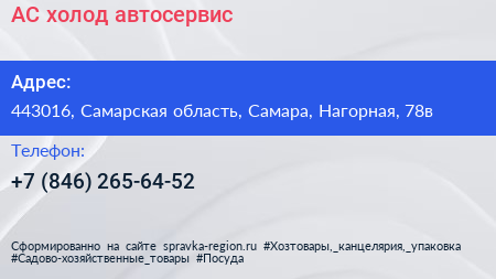 АС холод, автосервис по адресу 443016, Самарская область, Самара, Нагорная, 78в в дальнейшем Организация, размещена в следующих категориях: