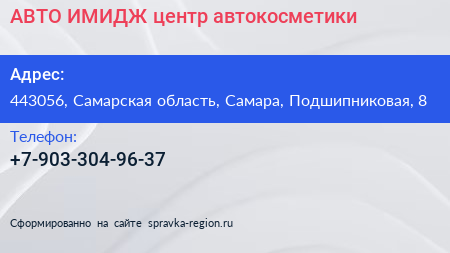 АВТО-ИМИДЖ, центр автокосметики по адресу 443056, Самарская область, Самара, Подшипниковая, 8 в дальнейшем Организация, размещена в следующих категориях: