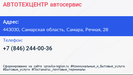 АВТОТЕХЦЕНТР, автосервис по адресу 443030, Самарская область, Самара, Речная, 28 в дальнейшем Организация, размещена в следующих категориях: