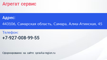 Агрегат сервис по адресу 443106, Самарская область, Самара, Алма-Атинская, 45 в дальнейшем Организация, размещена в следующих категориях: