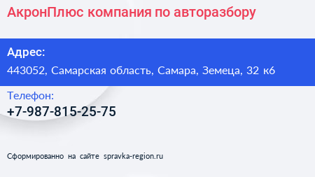 АкронПлюс, компания по авторазбору по адресу 443052, Самарская область, Самара, Земеца, 32 к6 в дальнейшем Организация, размещена в следующих категориях: