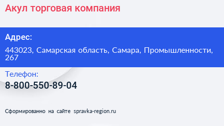 Акул, торговая компания по адресу 443023, Самарская область, Самара, Промышленности, 267 в дальнейшем Организация, размещена в следующих категориях: