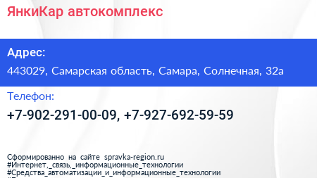 ЯнкиКар, автокомплекс по адресу 443029, Самарская область, Самара, Солнечная, 32а в дальнейшем Организация, размещена в следующих категориях: