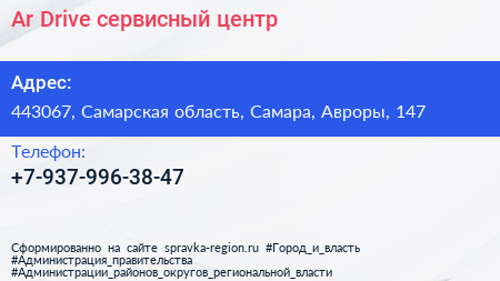 Ar Drive, сервисный центр по адресу 443067, Самарская область, Самара, Авроры, 147 в дальнейшем Организация, размещена в следующих категориях: