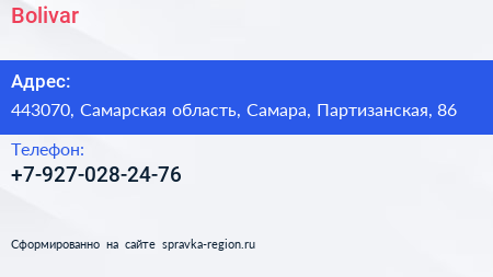 Bolivar по адресу 443070, Самарская область, Самара, Партизанская, 86 в дальнейшем Организация, размещена в следующих категориях: