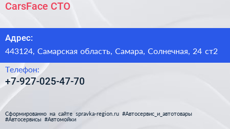 CarsFace, СТО по адресу 443124, Самарская область, Самара, Солнечная, 24 ст2 в дальнейшем Организация, размещена в следующих категориях: