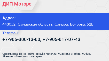 ДИП Моторс по адресу 443052, Самарская область, Самара, Боярова, 52Б в дальнейшем Организация, размещена в следующих категориях: