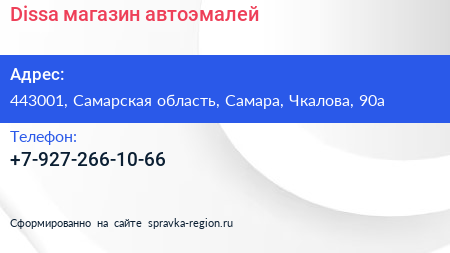 Dissa, магазин автоэмалей по адресу 443001, Самарская область, Самара, Чкалова, 90а в дальнейшем Организация, размещена в следующих категориях: