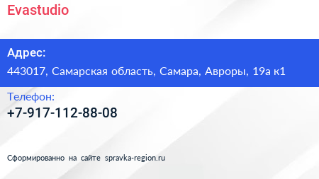 Evastudio по адресу 443017, Самарская область, Самара, Авроры, 19а к1 в дальнейшем Организация, размещена в следующих категориях: