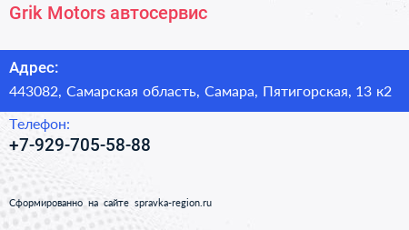 Grik Motors, автосервис по адресу 443082, Самарская область, Самара, Пятигорская, 13 к2 в дальнейшем Организация, размещена в следующих категориях: