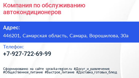 Компания по обслуживанию автокондиционеров по адресу 446201, Самарская область, Самара, Ворошилова, 30а в дальнейшем Организация, размещена в следующих категориях: