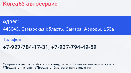 Korea63, автосервис по адресу 443045, Самарская область, Самара, Авроры, 150а в дальнейшем Организация, размещена в следующих категориях: