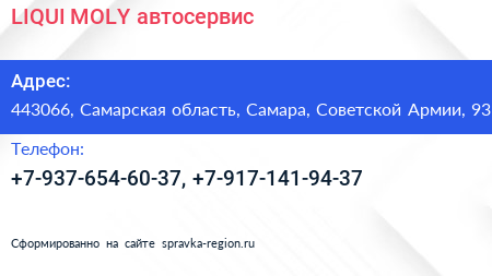 LIQUI MOLY, автосервис по адресу 443066, Самарская область, Самара, Советской Армии, 93 в дальнейшем Организация, размещена в следующих категориях: