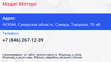 Мадис Моторс по адресу 443044, Самарская область, Самара, Товарная, 70 к8 в дальнейшем Организация, размещена в следующих категориях: