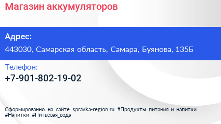 Магазин аккумуляторов по адресу 443030, Самарская область, Самара, Буянова, 135Б в дальнейшем Организация, размещена в следующих категориях:
