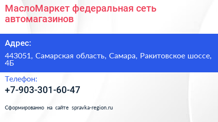 МаслоМаркет, федеральная сеть автомагазинов по адресу 443051, Самарская область, Самара, Ракитовское шоссе, 4Б в дальнейшем Организация, размещена в следующих категориях: