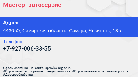 Мастер+, автосервис по адресу 443050, Самарская область, Самара, Чекистов, 185 в дальнейшем Организация, размещена в следующих категориях:
