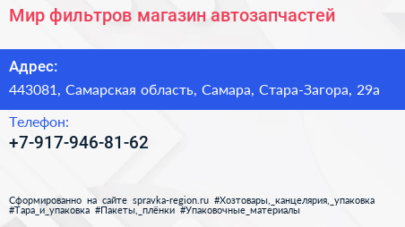 Мир фильтров, магазин автозапчастей по адресу 443081, Самарская область, Самара, Стара-Загора, 29а в дальнейшем Организация, размещена в следующих категориях: