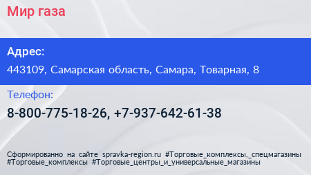 Мир газа по адресу 443109, Самарская область, Самара, Товарная, 8 в дальнейшем Организация, размещена в следующих категориях:
