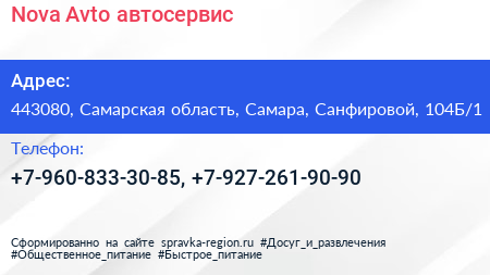 Nova Avto, автосервис по адресу 443080, Самарская область, Самара, Санфировой, 104Б/1 в дальнейшем Организация, размещена в следующих категориях: