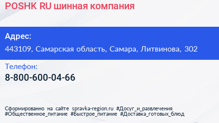 POSHK.RU, шинная компания по адресу 443109, Самарская область, Самара, Литвинова, 302 в дальнейшем Организация, размещена в следующих категориях: