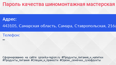 Пароль качества, шиномонтажная мастерская по адресу 443105, Самарская область, Самара, Ставропольская, 216а в дальнейшем Организация, размещена в следующих категориях: