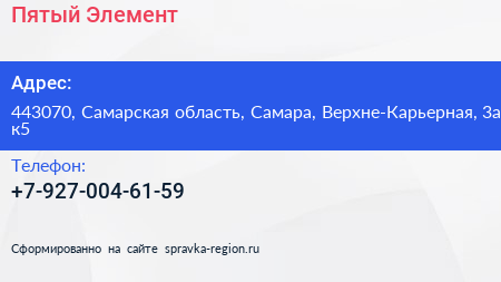 Пятый Элемент по адресу 443070, Самарская область, Самара, Верхне-Карьерная, 3а к5 в дальнейшем Организация, размещена в следующих категориях: