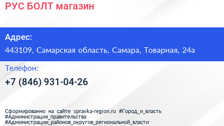 РУС. БОЛТ, магазин по адресу 443109, Самарская область, Самара, Товарная, 24а в дальнейшем Организация, размещена в следующих категориях:
