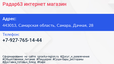 Радар63, интернет-магазин по адресу 443013, Самарская область, Самара, Дачная, 28 в дальнейшем Организация, размещена в следующих категориях: