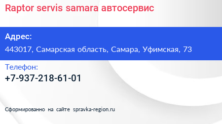Raptor servis samara, автосервис по адресу 443017, Самарская область, Самара, Уфимская, 73 в дальнейшем Организация, размещена в следующих категориях:
