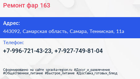 Ремонт фар 163 по адресу 443092, Самарская область, Самара, Теннисная, 11а в дальнейшем Организация, размещена в следующих категориях: