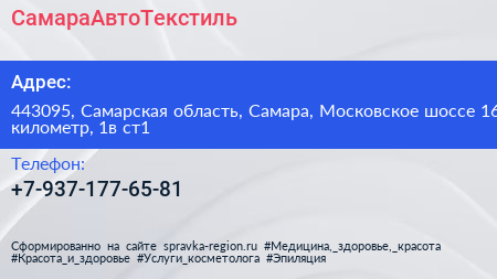СамараАвтоТекстиль по адресу 443095, Самарская область, Самара, Московское шоссе 16 километр, 1в ст1 в дальнейшем Организация, размещена в следующих категориях: