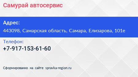 Самурай, автосервис по адресу 443098, Самарская область, Самара, Елизарова, 101е в дальнейшем Организация, размещена в следующих категориях: