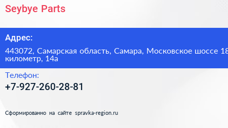 Seybye Parts по адресу 443072, Самарская область, Самара, Московское шоссе 18 километр, 14а в дальнейшем Организация, размещена в следующих категориях: