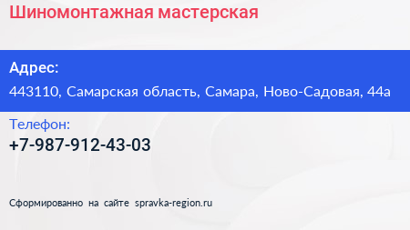 Шиномонтажная мастерская по адресу 443110, Самарская область, Самара, Ново-Садовая, 44а в дальнейшем Организация, размещена в следующих категориях: