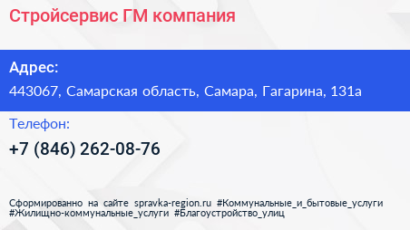 Стройсервис-ГМ, компания по адресу 443067, Самарская область, Самара, Гагарина, 131а в дальнейшем Организация, размещена в следующих категориях: