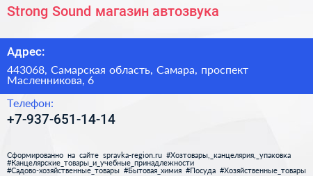 Strong Sound, магазин автозвука по адресу 443068, Самарская область, Самара, проспект Масленникова, 6 в дальнейшем Организация, размещена в следующих категориях: