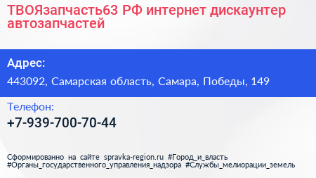 ТВОЯзапчасть63.РФ, интернет-дискаунтер автозапчастей по адресу 443092, Самарская область, Самара, Победы, 149 в дальнейшем Организация, размещена в следующих категориях: